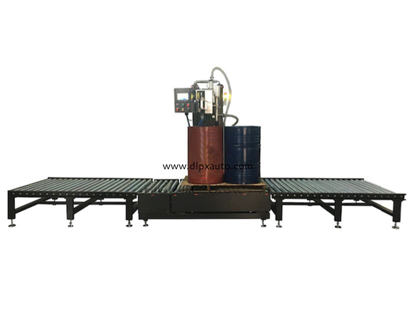 應用案例 高灌噸位稱重式灌裝機,原理是由稱重傳感器平臺在PLC控制下設定計量.是高精度,高技術產品.是集機、電、儀一體化的新型機種,它改變了傳統流量計式灌裝機定量精度及無法對較粘液體的計量缺陷.是文明生產和國家明令規定淘汰杠桿秤后,融稱重與灌裝一體化的理想設備.灌裝時先去除皮重,物料在注入容器時先大量快速灌裝后再慢速小劑量修正計量.操作者只需要將容器放入平臺,桶口對準灌裝咀,此時程序啟