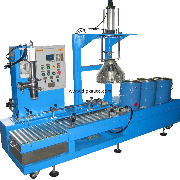 人工將空桶放到秤臺(tái)上,,然后點(diǎn)擊啟動(dòng)按鈕,儀表首先判桶并扣除空桶皮重,灌裝頭下降并插入桶內(nèi)并打開(kāi)進(jìn)入快速落料,當(dāng)達(dá)到慢進(jìn)料設(shè)定重量時(shí),自動(dòng)轉(zhuǎn)為慢速落料。當(dāng)重量達(dá)到目標(biāo)值時(shí)停止落料,此時(shí)灌裝頭復(fù)位到初始狀態(tài),儀表回皮顯示總重,人工將成品桶移出并人工放蓋推到壓蓋區(qū),腳踏開(kāi)關(guān)啟動(dòng),壓蓋氣缸伸出并壓蓋,壓蓋完成人工取下桶,整個(gè)動(dòng)作流程結(jié)束。