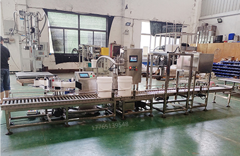 工作流程: 人工上空桶 - 空桶自動輸送 - 空桶自動尋口 - 自動定量灌裝 自動理蓋 -自動落蓋 自動旋蓋 -重桶自動輸送 -機(jī)械碼垛即完成。