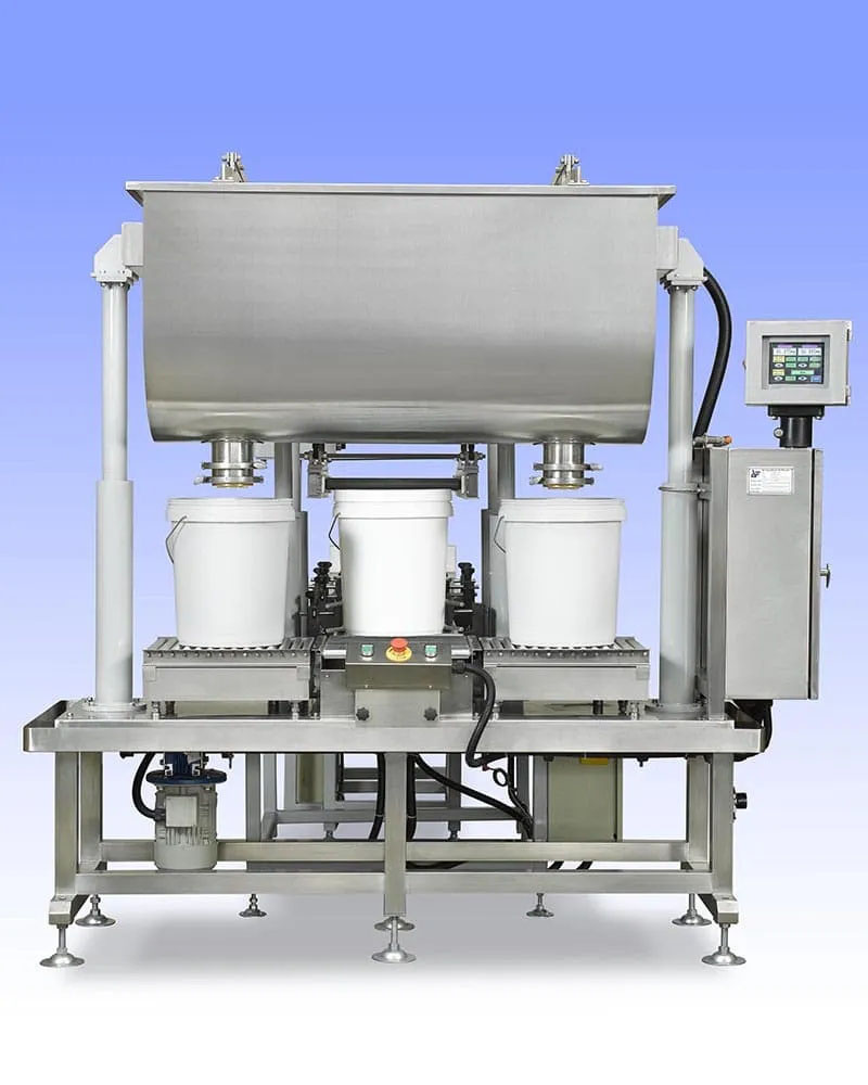 AF半自動開頂圓罐灌裝線,設計灌裝范圍為1~20kg重量。灌裝系統參數設置,自動調整預設罐頭尺寸和重量。半自動系統由兩個稱重灌裝站、自動壓蓋系統和重力輸送機組成。其他在線站,例如皮帶輸送機(用于噴墨系統)和運動檢查秤是可選項目,可以集成為灌裝線。