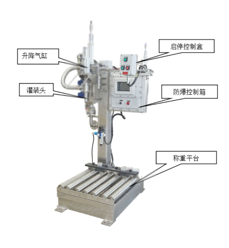 1.1、本機主要由防爆裝置、電控系統、光電檢測、稱重裝置、灌裝裝置等部分組成。
