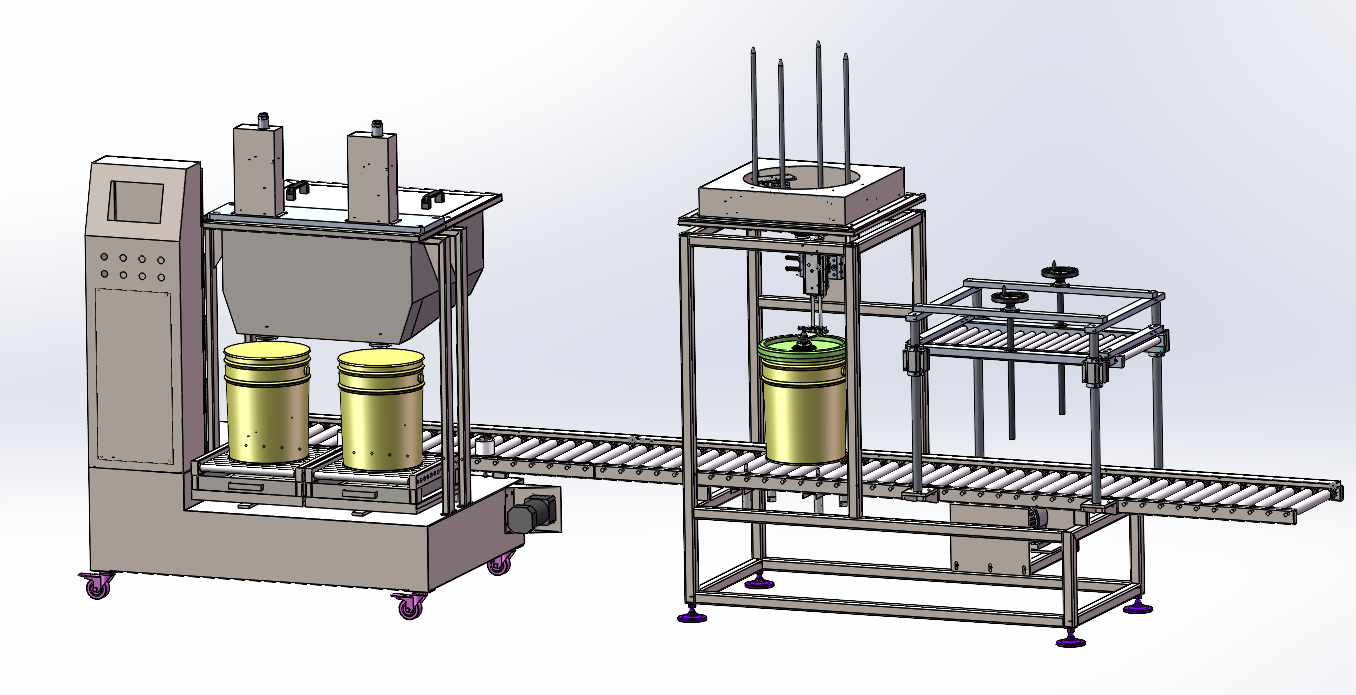 4.人工上蓋、緊蓋,蓋好蓋子的桶移出灌裝工位,上蓋壓蓋,然后借助斜坡滾筒下到地面;或者動(dòng)力滾筒輸送出生產(chǎn)線;如果是小蓋,可以增加氣動(dòng)馬達(dá)旋蓋機(jī),人工旋蓋即可。