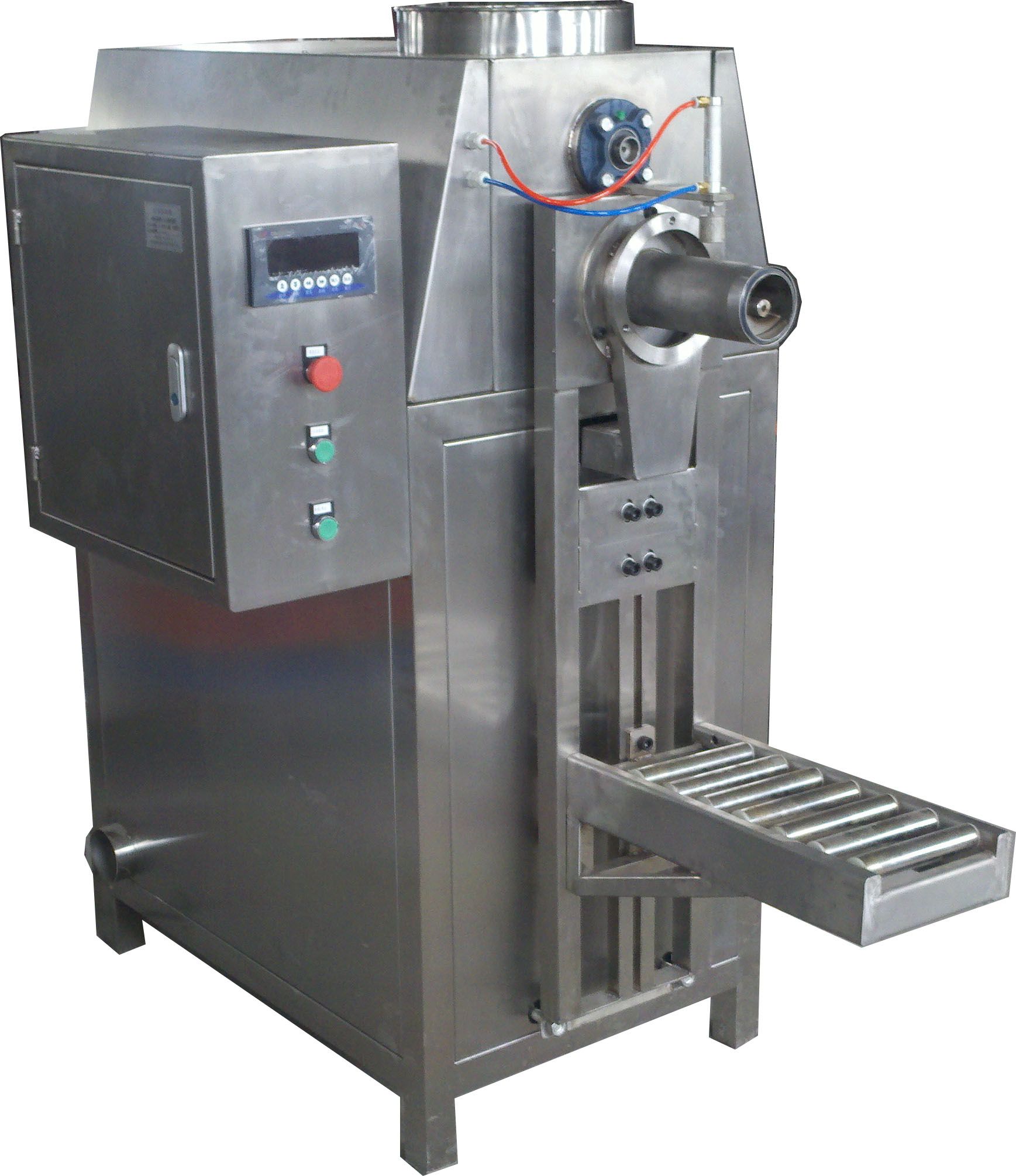 將閥口包裝袋套在加料嘴上,按動(dòng)“允加”按鈕,這時(shí)壓袋氣缸開始工作并壓住袋口,控制器將包裝袋重量自動(dòng)去除,破拱電機(jī)緩慢轉(zhuǎn)動(dòng),保證下料暢通。加料螺旋高速轉(zhuǎn)動(dòng)迅速將物料灌入袋中,隨袋中空氣一起溢出的粉塵通過吸塵器由除塵器吸走,振動(dòng)裝置同時(shí)啟動(dòng)將托盤上袋中物料振實(shí)充滿袋角。待加料快到設(shè)定值時(shí),加料螺旋進(jìn)行減速慢加,到設(shè)定值時(shí),加料停止。誤差<0.3%。這時(shí)壓袋氣缸松開袋口,將包裝袋放在皮帶輸送機(jī)上及時(shí)送出。