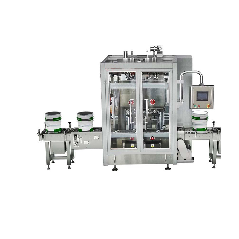 設備自動將空桶輸送到充氮區進行灌前充氮,充氮結束后,動力滾筒將包裝桶輸送至灌裝區進行灌裝,灌裝結束后,自動將滿桶輸送至上蓋區進行灌后充氮并自動上蓋,后端可模塊化配置自動貼標機,自動碼垛機。
